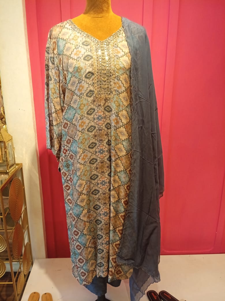 viscose heavy neck line salwar with dola silk dupatta , elasticated waistband pant