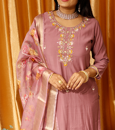 Salwar - Women's Purple Colour Chanderi Silk Heavy Neck Line Kurta With Dola Silk Dupatta And Elasticated Waistband Pant