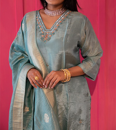 viscose heavy neck line salwar with dola silk dupatta, elasticated waistband pant