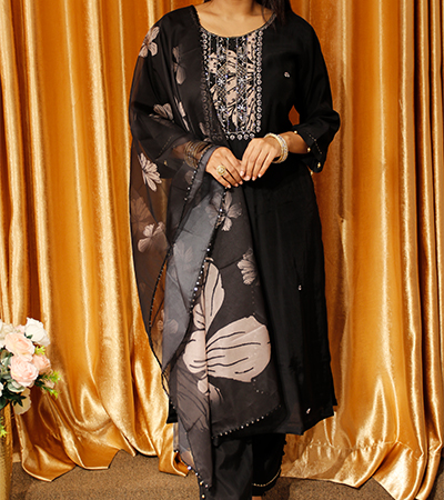 Black colour chanderi silk heavy neck line salwar with dola silk dupatta , elasticated waistband pant