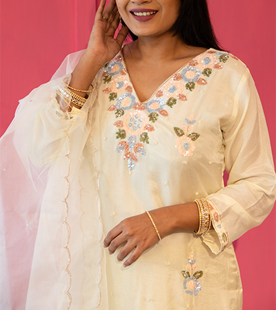 heavy neck line silk salwar with plain organza dupatta , elasticated waistband pant