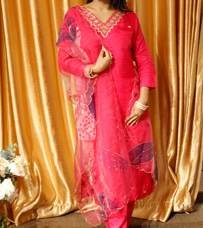 magenta pink heavy neck line in chanderi silk kurta with heavy organza dupatta, elasticated waistband pant