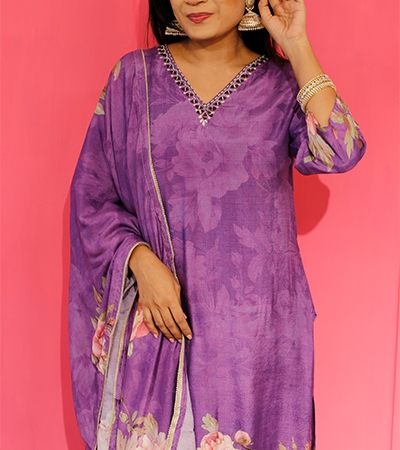 purple muslin salwar with flower print ,muslin full print dupatta, elasicated waistband pant
